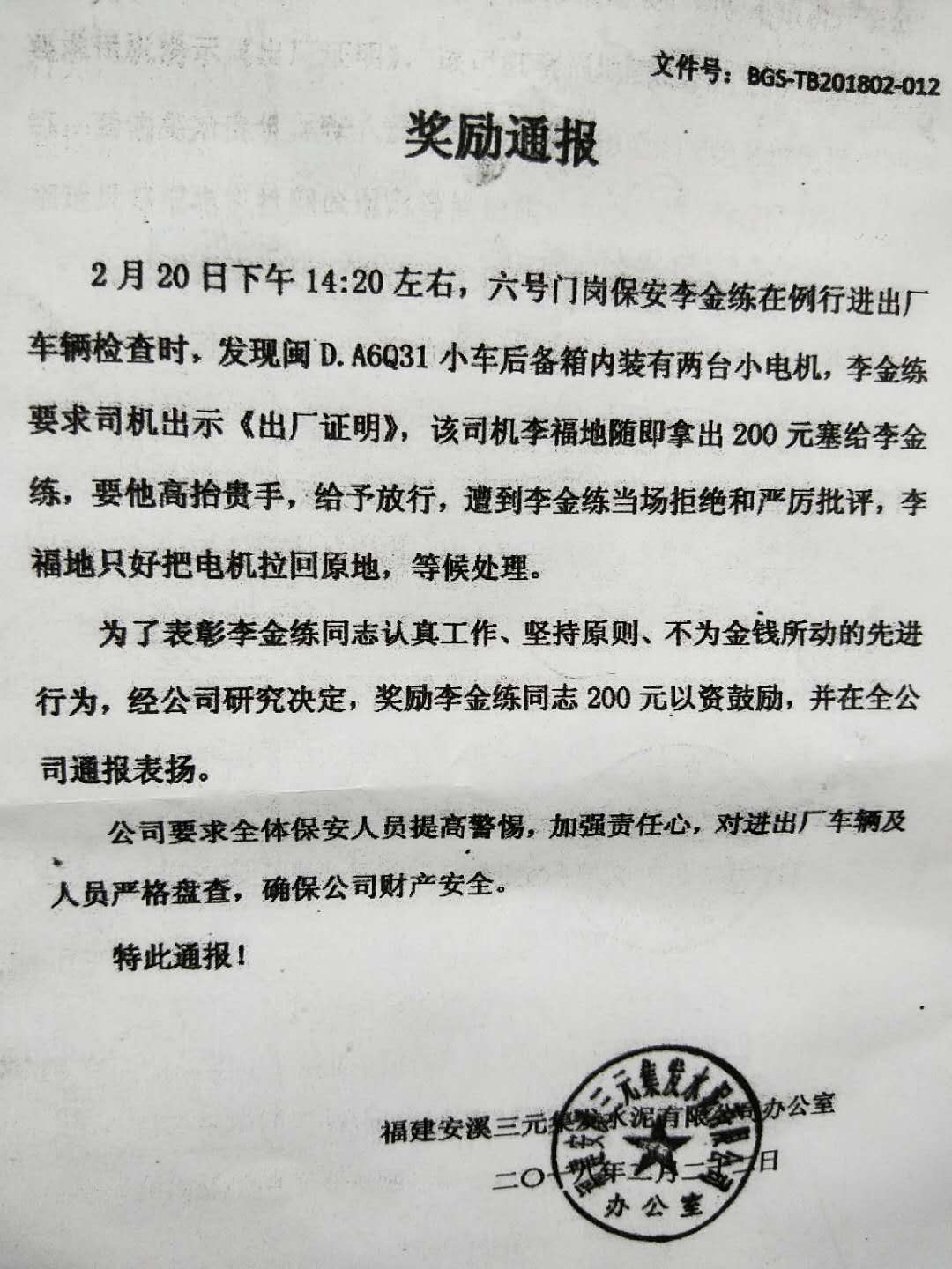 2月20日,正逢大年初五,受保单位处于全员放假期间,保安员李金练等人依旧坚守在各自的工作岗位上。下午14时20分许,六号岗保安员李金练在对进出厂车辆进行例行检查时,发现一辆挂厦门牌照小轿车的后备箱内装有两台小电机,李金练依规要求驾驶员李某福出示出厂证明,李某福支支吾吾,在无法提供合法出厂手续的情况下,见四下无人,掏出200元现金硬要塞给李金练,要他高抬贵手,给予放行。李金练正义凛然的予以当场拒绝,并对李某福的行为进行严厉批评,同时将现场情况及时报告给客户单位安保负责人,把嫌疑人和无法提供合法出厂手续的小电机移交客户处理。