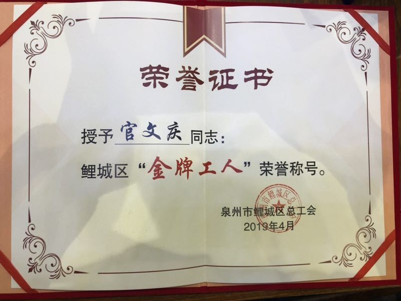 为表彰先进、凝聚力量,展示新时期劳动者的动人风采,4月29日,泉州市鲤城区总工会、鲤城区人力资源和社会保障局、鲤城区工业和信息化局联合召开鲤城区表彰先进大会,表彰一批区“金牌工人”和“五一劳动奖章”获得者。福建省集英保安集团权属子公司福建省集英物业管理有限公司职工官文庆榜上有名,被评为鲤城区“金牌工人”。