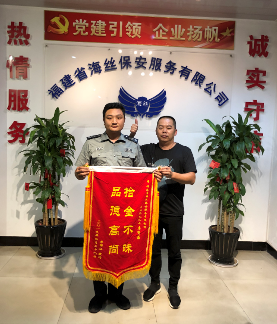 在李队长看来,这仅仅只是外出游玩发生的小小插曲,并没有放在心上。失主李先生通过派出所了解到李队长的信息,在5月5日下午,特地来到公司感谢李队长,并赠与“拾金不昧、品德高尚”锦旗一面以此表达感激之情。海丝公司总经理孙惠东先生、副总经理叶亚志先生热情接待了李先生,并与李先生热情交流探讨保安工作。李先生感慨道,“拾金不昧本来觉得是件小事,但轮到自己亲身经历,丢失物品后着急的心情以及得知可以寻回丢失物品之后的欣喜之情,实实在在的体验到了海丝保安公司发挥的社会正能量,让他倍感欣慰。”孙惠东总经理表示,不止李贺蕾队长,每一个海丝保安员都具有良好的道德规范,在外出遇到困难需要帮助时,若看到周边有海丝保安员都可以向他们寻求帮助,海丝公司的保安队员们不管在何时何地,只要社会需要,人民需要,都将献出自己的一份力所能及的力量。