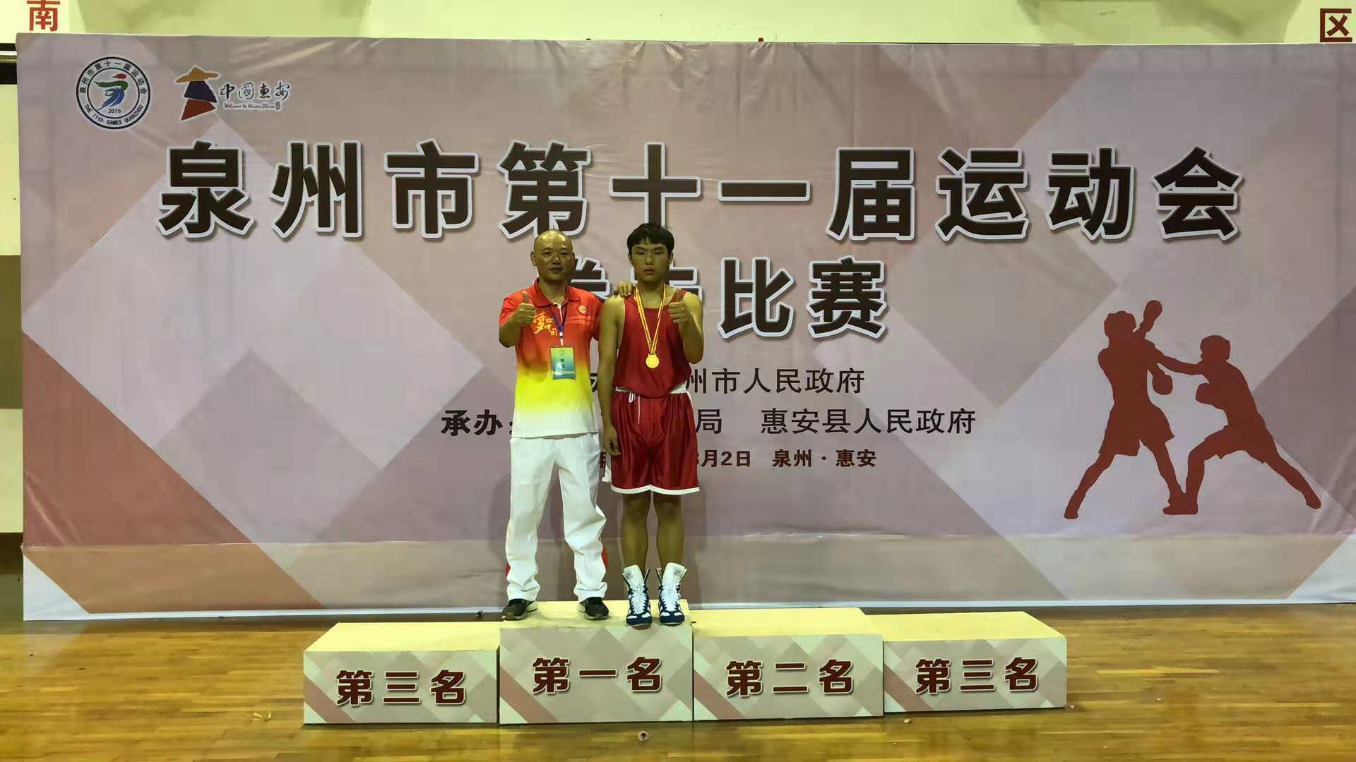 值得庆祝的是惠安县拳击健儿们在本届比赛中不畏强手,奋勇拼搏,共斩获8金5银11铜,取得金牌总数和总分双第一的辉煌战绩。而让人意外和振奋的是,代表惠安队参赛的拳击健儿们的功勋教练员蔡阳文先生,就是来自惠安剑盾保安公司押运分公司的一名分队长。身怀“绝技”的他,利用业余时间担任兼职教练员,为参加此次比赛的惠安运动健儿们进行科学系统的训练,带领他的学生们精心备战,刻苦训练,为惠安争得了巨大荣誉。