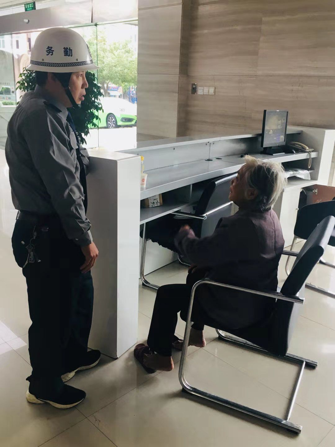2019年12月3日下午16时左右,石狮市保安服务公司驻工行八七路支行保安员杨池水正在开展值班巡逻工作。当巡逻到支行门口时,一位年逾八旬的老人引起了他的注意。经过简单的交流后,杨池水了解到老人是迷路了,他看到老人疲惫的样子,立即将老人搀扶进工行营业大厅内,先让老人休息,并将情况向银行主管领导汇报。为尽快帮助老人回家,杨池水一边耐心帮助老人回忆身份信息,一边联系派出所民警告知情况。随后,民警立即赶到现场,双方共同安抚了老人的情绪,并把老人暂时带回了派出所。