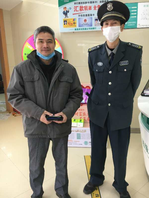 2020年2月16日14点多,永春县保安服务公司派驻永春县农业银行蓬壶支行网点保安员林国才在防控新型冠状病毒肺炎疫情期间,他做出了一件“拾金不昧”的好事。在营业网点大厅值班巡查时,保安员林国才发现等候区座椅上有一个黑色钱包,他第一时间向网点主管进行了报告。