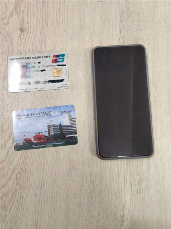 2021年11月11日8:30分,福建省海丝保安服务有限公司派驻福建医科大学附属第二医院东海院区保安队长姚祖海当班执勤巡逻时,在急诊大厅椅子上捡到华为手机1部、就诊卡和社保卡各1张,害怕错过失主回来寻找着急,姚祖海在急诊大厅原地等待二十分钟无果后才交至警务室,并在工作群里发布失物招领通知,让队员如果有人寻找失物可至警务室核对信息领取。消息发出40分钟后,失主陈女士来警务室领取并表示感谢,赞扬海丝保安员拾金不昧的高尚品德。