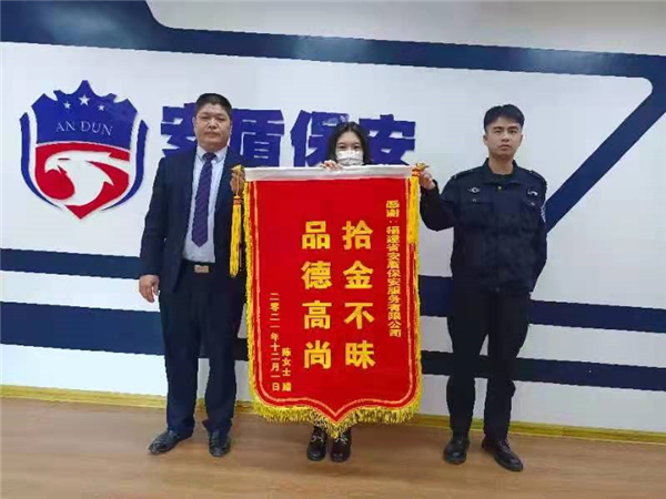 事后,陈女士专门制作一面绣有“拾金不昧,道德高尚”的锦旗送到福建省安盾保安服务有限公司,以此感谢梁抒宇同志拾金不昧的精神。