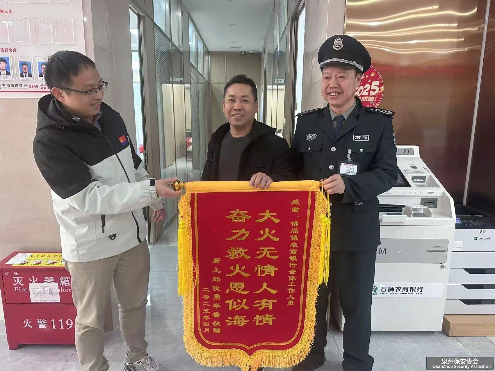 3月31日,石狮农商银行锦尚支行的保安员黄成辉在网点安全巡视过程中,发现新大街一栋居民楼有阵阵浓烟冒出来,立刻与支行员工带上灭火器前往现场查看情况。面对四楼厨房的熊熊烈焰,他们与热心商户并肩作战、轮番上阵,凭借无畏的勇气与专业的操作,最终在消防救援人员抵达前成功扑灭火源。4月2日,邱先生亲自将一面绣有“大火无情人有情,奋力救火恩似海”的锦旗送到石狮农商银行锦尚支行,同时,向保安员黄成辉与支行员工们表达了诚挚的感激之情。