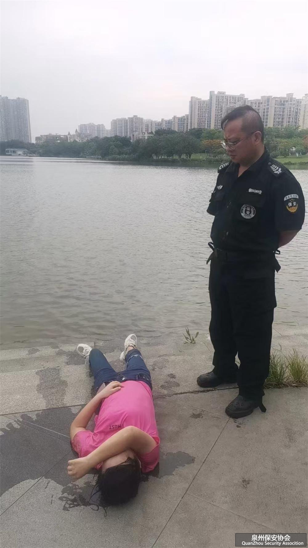 据悉,2025年5月25日上午大约11:00点左右,晋江市创和保安服务有限公司派驻晋阳湖公园巡逻人员王添水和往常一样开展日常巡逻工作,当巡逻至某水域时,发现有一名女子在河里面,整个人已快淹没了,在危急关头,队员王添水立即跳进河里进行施救,把人往岸上拉。但是由于女子不配合施救、使劲挣脱,给而此时刚好有两名男子经过,协助把女子拉到岸上来,队员也及时报警并将女子看护起来,待民警到达现场移交给民警带回派出所进一步处理。