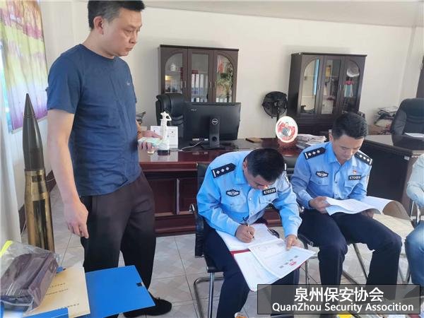 2022年10月26日上午,惠安县公安局治安管理大队“双随机”检查组到惠安剑盾保安公司押运分公司开展“双随机”检查。局驻保安公司联络员陈亚新、公司副总经理许维岁、党支部副书记、押运分公司负责人邱培强等陪同检查。