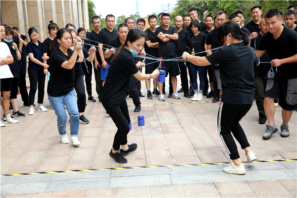 “合力建塔”大家紧握绳子,调整力度,掌握平衡,齐心协力搭建高塔。