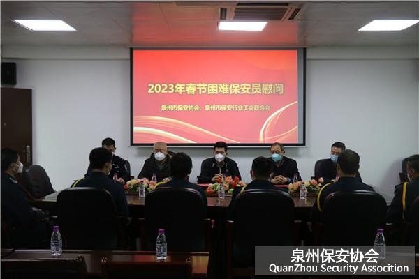 2023年1月11日至16日,泉州市保安协会与泉州市保安行业工会联合会开展2023年春节慰问活动,协会常务副会长万建平、副会长安国庆、秘书长柯富森及行业工会主席曾国艇等领导带队前往鲤城、丰泽、晋江等地,走访慰问170余名困难保安人员,向他们送上新春祝福和诚挚问候。