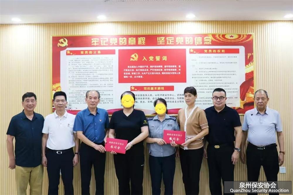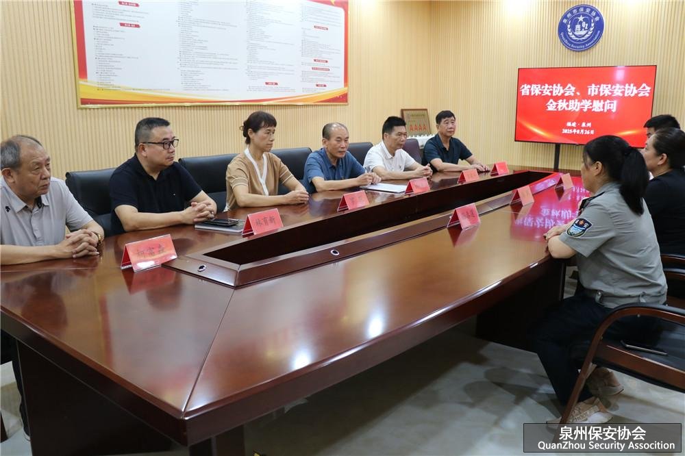 为弘扬保安行业互助精神,践行社会责任,8月26日,福建省保安协会与泉州市保安协会联合开展“金秋助学”活动,为考上大学的困难保安员家庭子女发放助学金。省保安协会党支部书记刘洪、副秘书长罗琛,市协会常务副会长万建平、副会长林育新、苏若煌及秘书长柯富森等领导共同参与此次活动。