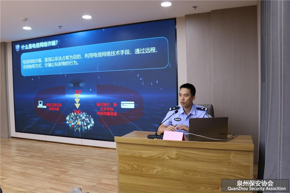 根据泉州市副市长、公安局局长柳建忠的指示要求和市公安局治安支队工作部署,泉州市保安协会于9月5日上午特邀泉州市公安局反诈骗中心三级警长林朱盛开展题为《反诈是门必修课 筑牢防线守好责》的主题宣讲。会议号召全市保安企业严格落实上级要求,共同推动全市反诈宣传工作扎实深入开展。