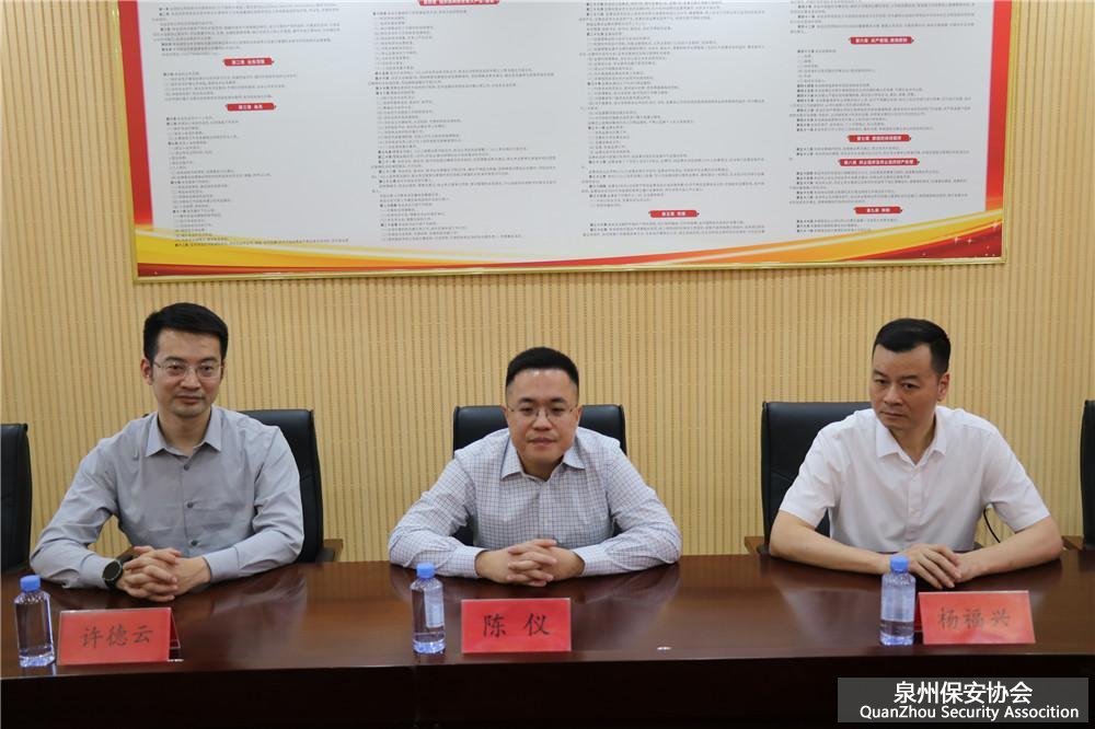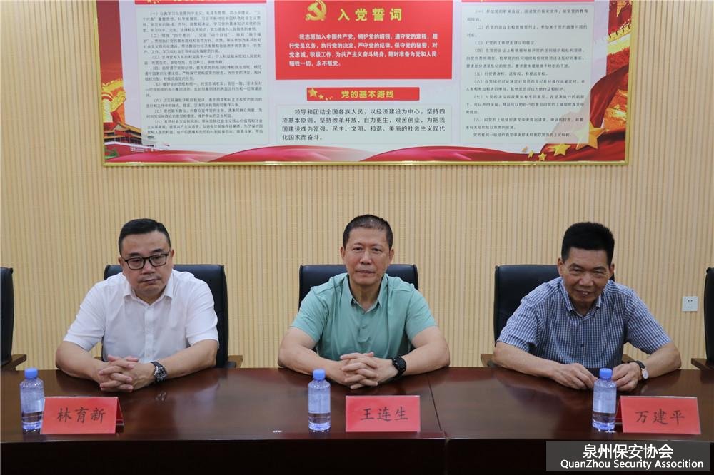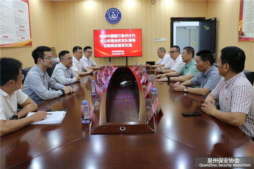 为进一步贯彻落实福建省保安协会和中国银行福建分行工作部署,深化金融赋能保安行业高质量发展工作,9月16日,中国银行泉州分行行长陈仪一行到泉州市保安协会开展座谈交流,市保安协会会长王连生、常务副会长万建平等领导参加座谈,市公安局治安支队支队长杨福兴陪同座谈。