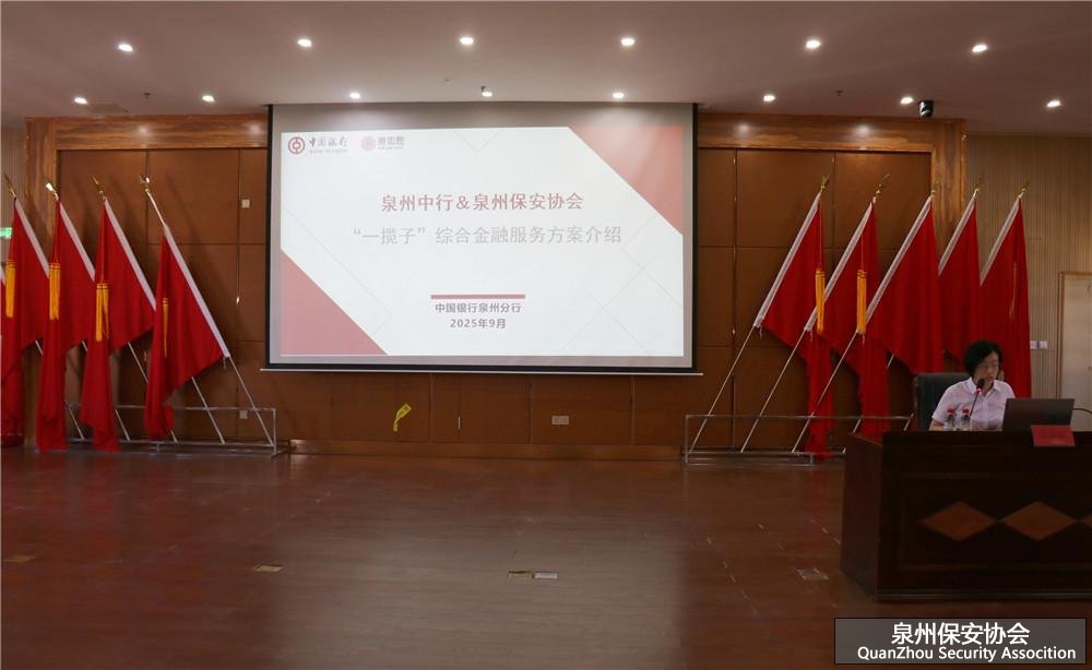 为贯彻落实省保安协会工作部署,切实发挥金融服务赋能作用。9月25日上午,市保安协会联合中国银行泉州分行、中银保险福建分公司组织召开全市保安行业专属金融服务推介会,中国银行泉州分行副行长许德云、林南甦,中银保险福建分公司副总经理陈广,协会副会长安国庆、苏若煌、杜振芳,秘书长柯富森等领导出席会议,全市保安企业代表参加会议。