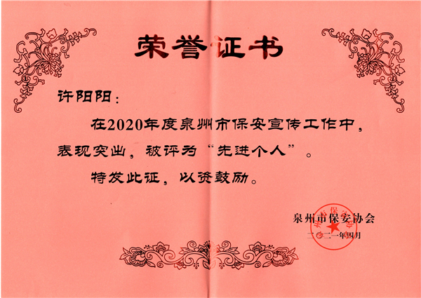 为鼓励先进,发挥典型带动作用,泉州市保安协会决定授予8家保安企业“2020年度泉州市保安宣传工作先进企业”、12名同志“2020年度泉州市保安宣传工作先进个人”荣誉称号,颁发牌匾、证书。泉州市集英保安守押有限公司荣获“2020年度泉州市保安宣传工作先进企业”荣誉称号,公司员工许阳阳被授予“2020年度泉州市保安宣传工作先进个人”荣誉称号。