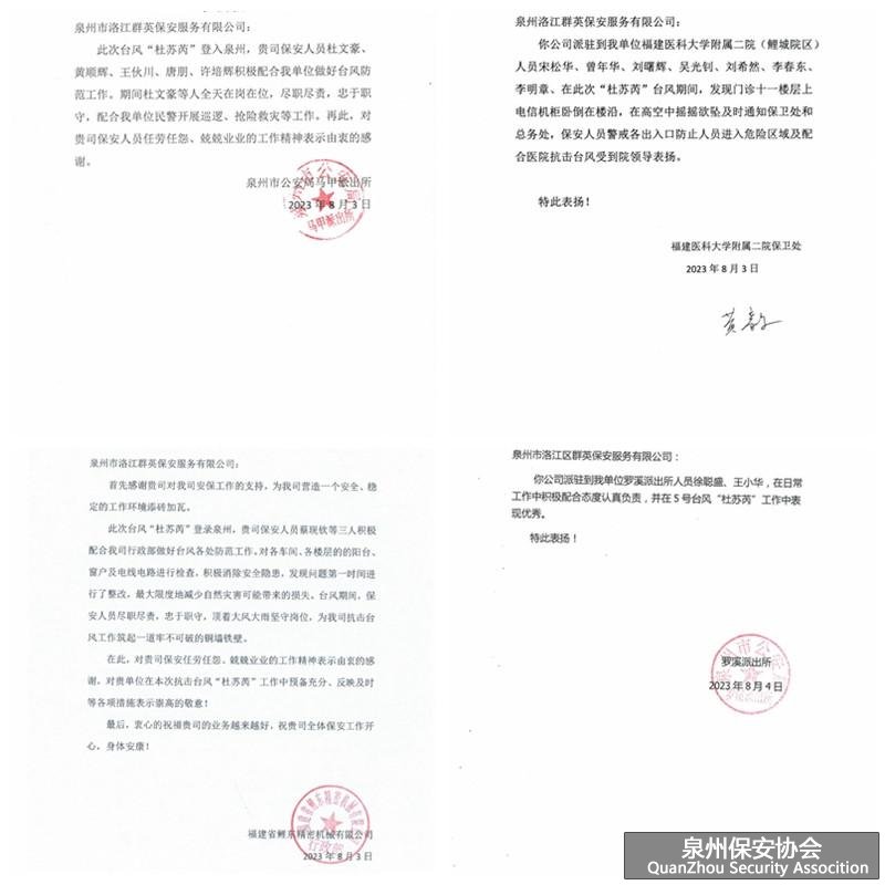 其中一份感谢信中客户单位说,此次台风“杜苏芮”登录泉州,我司保安员对客户单位电线电路进行检查,积极消除安全隐患,发现问题第一时间进行整改,最大限度地减少自然灾害可能带来的损失,对我司保安员在本次抗击台风“杜苏芮”工作准备充分、反应及时等各项措施落实到位表示崇高的敬意。