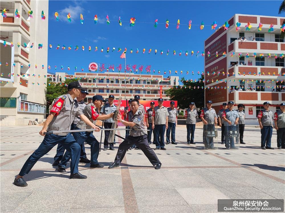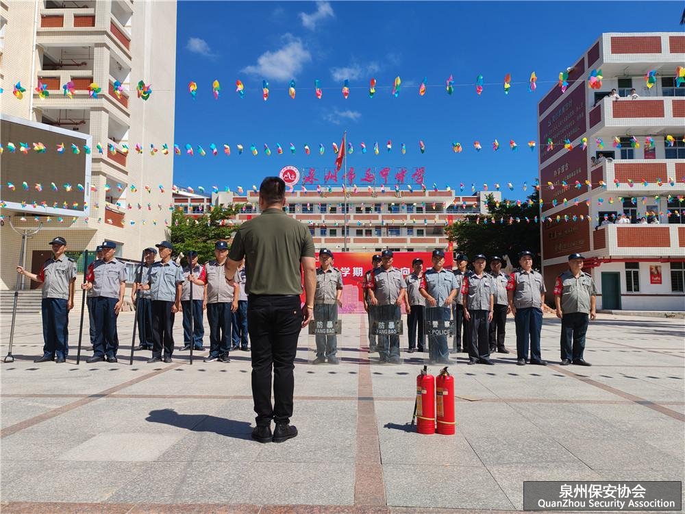 随着新学期开学临近,为进一步强化校园安全防范能力,筑牢校园安全防线,保障师生生命财产安全,8月28日上午,我司督查训练部队长李钦钊专程前往服务单位——泉州市马甲中学,组织该校保安分队开展防暴器械使用与灭火器操作专项培训,并就开学前各项安全准备工作进行细致部署与要求传达。