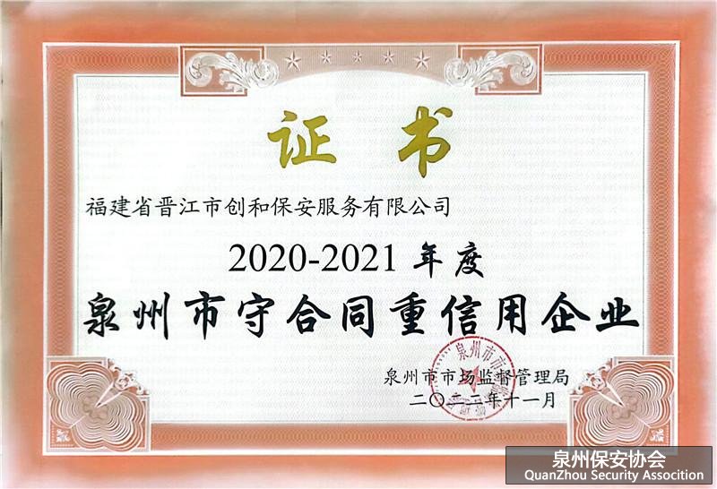 近日,晋江市创和保安服务有限公司喜获“2020-2021年度泉州市守合同重信用企业”荣誉。